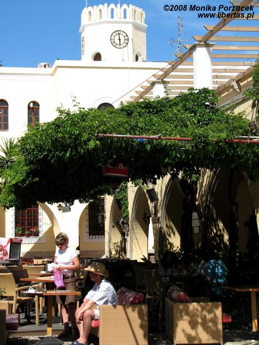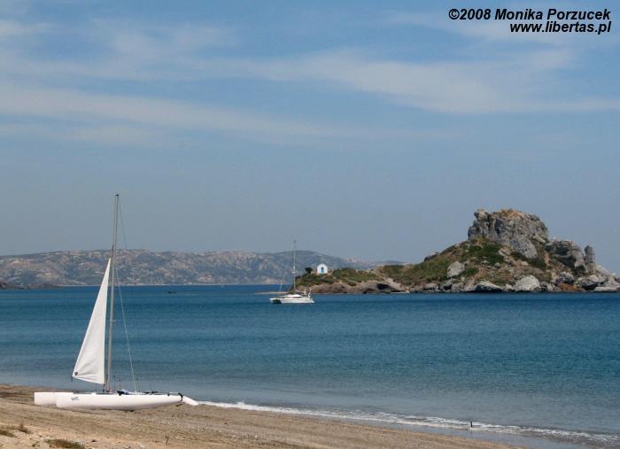 Za jakąś godzinę powitamy Kos. Prom gładko pokonuje morze... nie kołysze, nie skacze po falach. Można spokojnie podziwiać widoki i oddać się zadumie nad pięknem błękitu nieba i morza. Wysiadam chyba jako ostatnia. Na lądzie przy przystani słychać jakieś poruszenie. Ktoś biega tam i z powrotem coś wykrzykuje. Już widzimy... to opalony niewysoki mężczyzna biega wzdłuż tłumu pasażerów, którzy właśnie opuścili prom, w dłoniach trzyma ogromy zegar z ustawioną godziną, o której odpłynie z tego miejsca. Jakże zabawnie wygląda krzycząc donośnym głosem i gestykulując, tak żeby ten wielonarodowy tłum wyraźnie zrozumiał – odpływamy o 16:30!