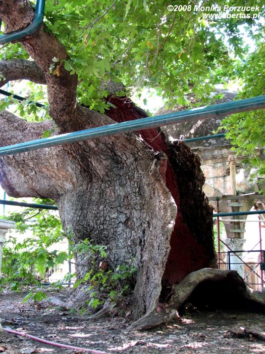 Tuż nad naszymi głowami jak miniaturowe gruszki wiszą zielone figi. Nie ma czasu ruszamy dalej. Jeszcze tylko obejrzymy wielkie drzewo Hipokratesa – platan pod którym siadał i udzielał lekcji. Kos to miejsce gdzie urodził się ten słynny ojciec medycyny (ok. 460 – 370 r p.n.e). Platan jest naprawdę potężny i stary, podparty konstrukcją, która podtrzymuje go przy życiu. Zgodnie z historią musiałby mieć jakieś 2500 lat, przewodnik zapewnia nas, że nie jest aż tak stary.