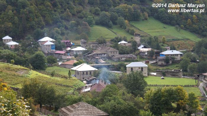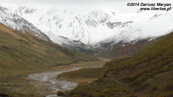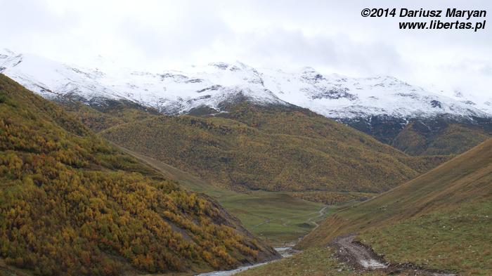 W końcu ruszyliśmy. Tak jak już wspomniałem, przejazd do Uszguli trwał około trzech godzin. W tym czasie podziwialiśmy wspaniałe krajobrazy Swanetii. Dwa razy zatrzymaliśmy się w pięknych punktach widokowych, aby rozprostować nogi. Z samego rana pogoda była piękna więc było na co popatrzeć. Później niestety powoli zaczęła się psuć i nieubłaganie gromadziły się chmury, ale nie padało, a to w Gruzji o tej porze roku całkiem nieźle.