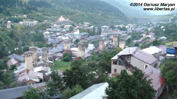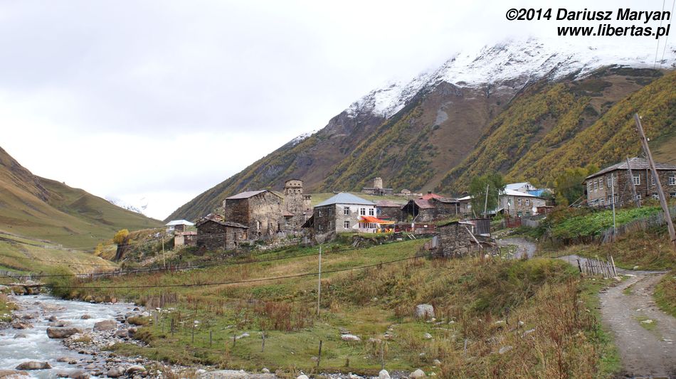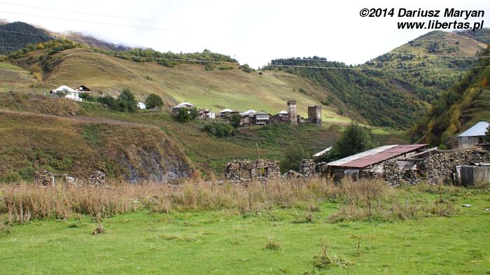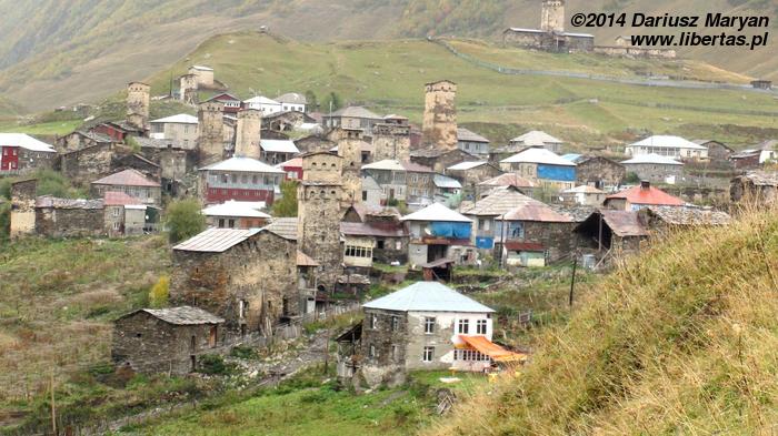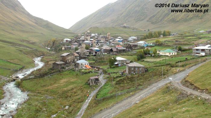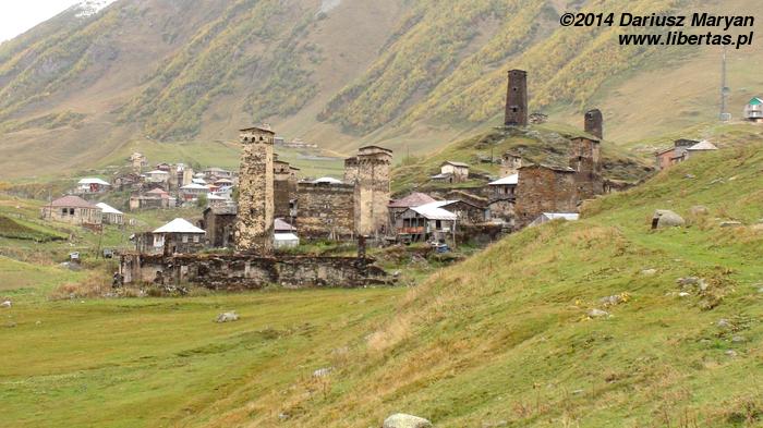 Samo Uszguli składa się z kilku oddalonych od siebie o rzut kamieniem wiosek. W każdej dominującym elementem są kamienne wieże obronne. Nad całą okolicą góruje najwyższy szczyt Gruzji – Szchara. Wioska w dużej mierze zachowała swój pierwotny klimat. Turystyka w tym miejscu nie jest jeszcze tak masowa jak w Mestii, choć oczywiście i tu można znaleźć nocleg czy miejsce, gdzie da się coś zjeść.