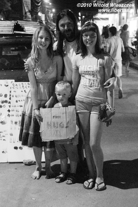 Jakiś bosy człowiek zabawia dzieciaki puszczając ogromne bańki mydlane i próbując nauczyć ich tej - jak się okazuje - bardzo trudnej sztuki. Obok jak piłeczka podskakuje śliczna, uśmiechnięta od ucha do ucha dziewczynka w niebieskiej sukience. Trzyma w ręce karton napisem Free Hugs