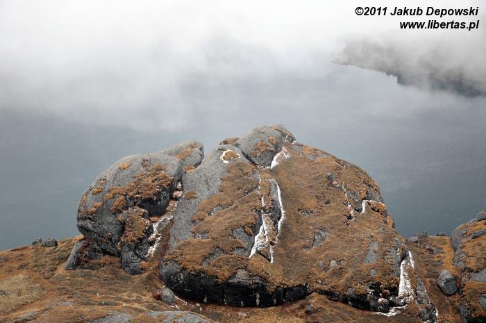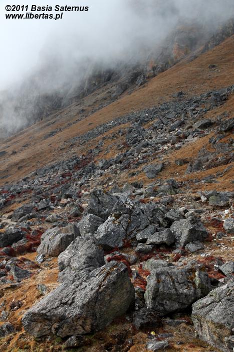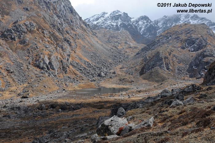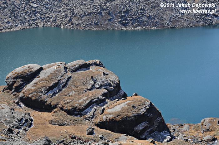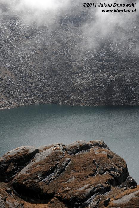 Jesień w Gosainkund1 pachnie rozgrzaną słońcem skałą. Nic dziwnego. Przecież nie licząc bezkresu nieba i kilku lazurowych zwierciadeł rozrzuconych po okolicy jezior, wiele więcej prócz kamieni tutaj nie ma. O ile przeważnie o uroku wysokogórskich, nepalskich szlaków decyduje mnogość strzelistych piramid, lodowe rzeźby oraz śnieżne czapy, o tyle krajobraz tej ukrytej na wysokości ponad czterech kilometrów, świętej dla hinduistów krainy2 niemal w całości buduje ciężki, surowy granit – w wyższych partiach zupełnie nagi, niżej zaś gdzieniegdzie wysłany prześcieradłami przesuszonych himalajskim klimatem porostów i traw. Październikową barwą tego odrobinę monotonnego, co absolutnie nie znaczy, że pozbawionego piękna, zakątka jest soczysty, rudawy brąz, czasem wręcz pomarańcz.