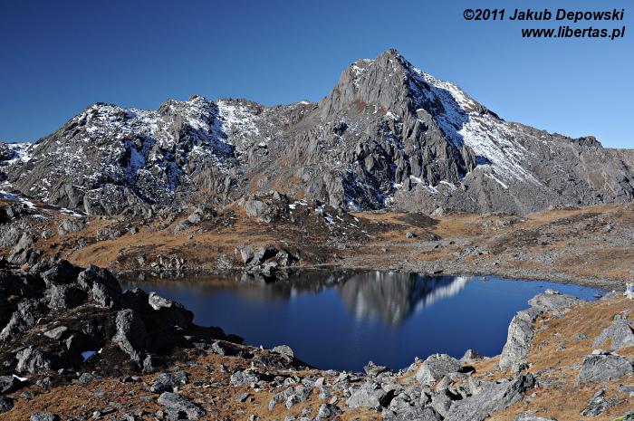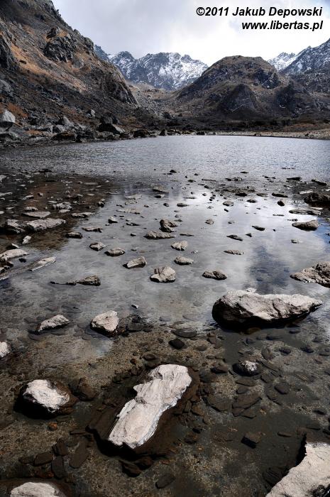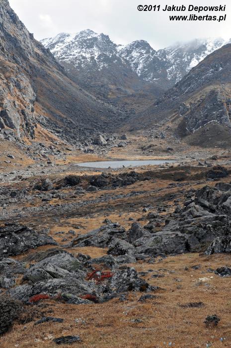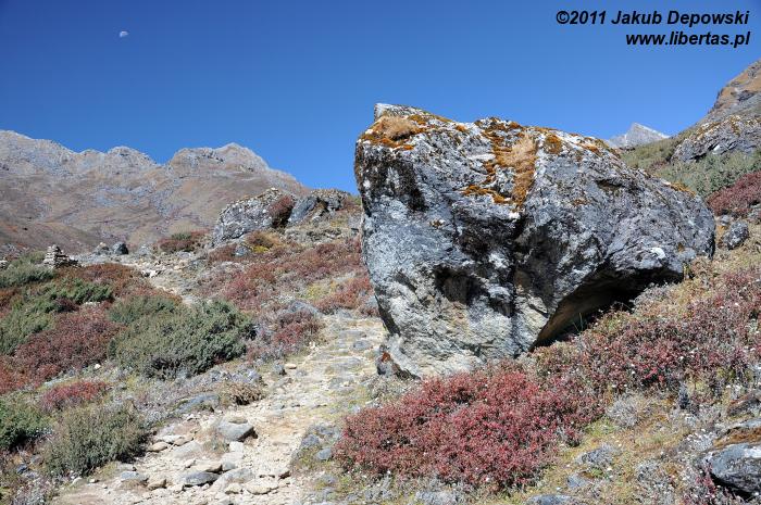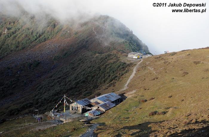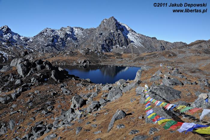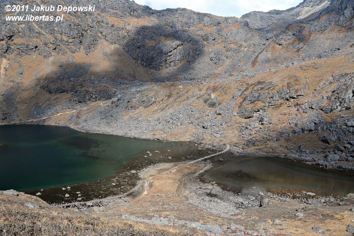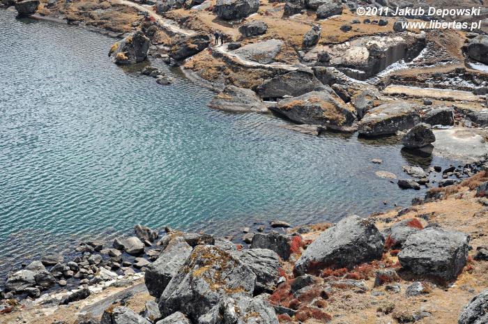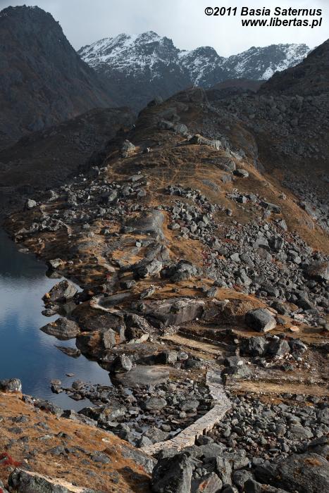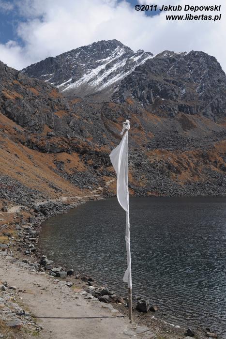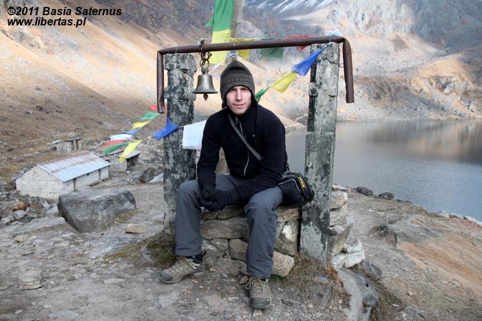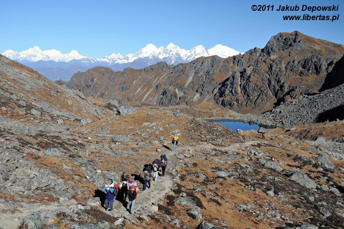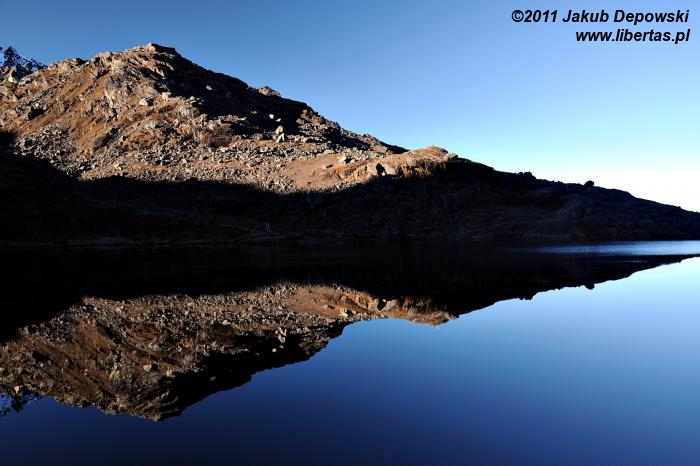 Poranki na himalajskich szlakach przekraczających wysokość czterech kilometrów bywają mroźne. Nie inaczej jest tym razem. Na zewnątrz blisko dziesięć kresek w minusie. Wstajemy o brzasku i szybciutko zamieniamy nocne okrycia na ciepłą, niemal zimową odzież. W kilka minut pakujemy dobytek, w budzącej się dopiero do życia hotelowej jadalni zagryzamy gorącą herbatę pysznym czekoladowym plackiem i bez ociągania się ruszamy w stronę przełęczy. Znów dopisuje nam aura. Niebo bezwstydnie nagie. Jeszcze przed chwilą wnętrze płytkiej dolinki wypełniało mroczne, niebieskie światło, ale dotyk wznoszącego się coraz wyżej słońca przemienił je w pomarańczową jasność. Momentalnie wszystko stało się wyraźne. Niesamowite jakże inaczej niż poprzedniego dnia wygląda cała okolica. Rozpromienione zbocza z podziwem przyglądają się sobie w idealnie gładkich taflach jeziorek. My również nie możemy od nich oderwać oczu. Oczarowani urokiem krajobrazu krok po kroku pokonujemy wysokość.