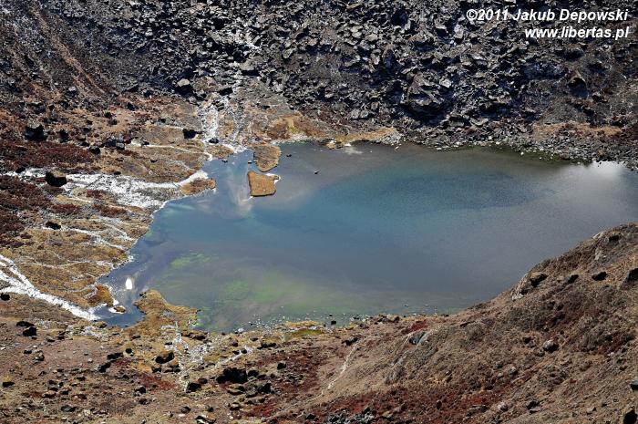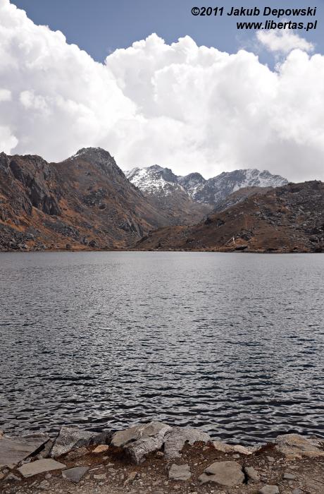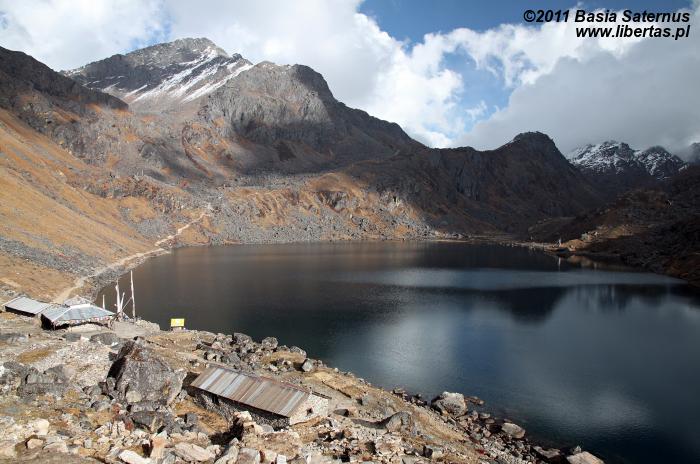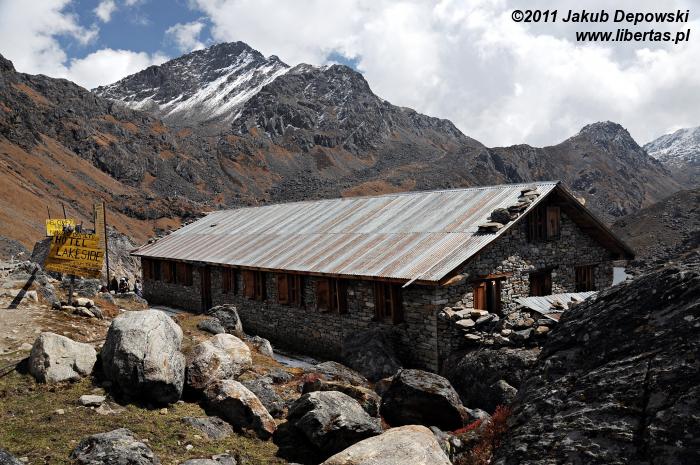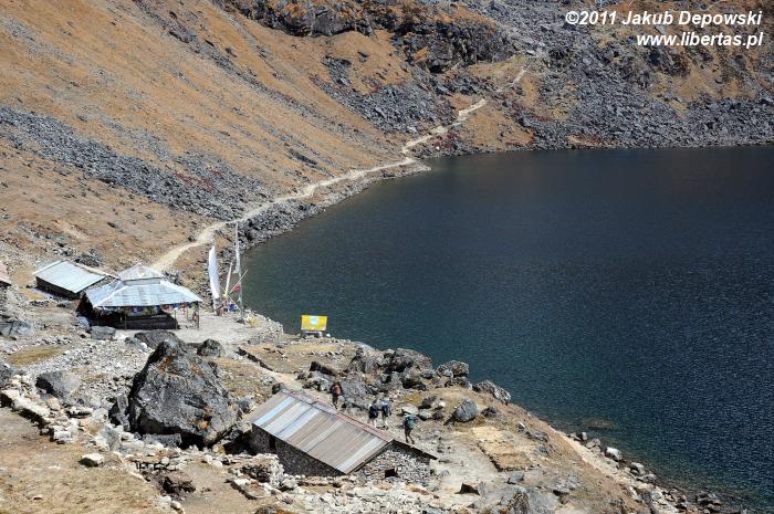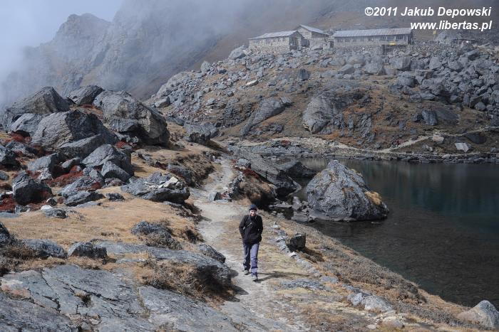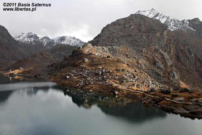 Do Gosainkund (4380 m n.p.m.) przybyliśmy dzień wcześniej niż planowaliśmy. Jeszcze wczoraj cieszyliśmy się przepysznym śniadaniem w wiosce Syabru3 (Thulo Shyaphru, 2250 m n.p.m.), w której zbieraliśmy siły po półtoratygodniowej przygodzie w Dolinie Langtang, a teraz - niespełna trzydzieści godzin później, siedzimy już wygodnie na ganku położonego ponad dwa kilometry wyżej hoteliku Peacefull Lake. Trochę obawiając się rywalizacji o wcale nieliczne tutaj miejsca noclegowe4 zaraz po przybyciu przystąpiliśmy do meldunkowych formalności, dzięki czemu ze zdobyciem dwuosobowego pokoju nie było większego kłopotu. Zdążyliśmy już jego skromne, lecz schludne i przytulne wnętrze oswoić oraz trochę odpocząć, nie pozostaje nam zatem nic innego, jak udać się na upojny spacer zanim popołudniowy opar przysłoni widoki. Na razie pogoda zupełnie przyzwoita. Względnie czyste niebo i dziesięciostopniowy upał. W oddali, na poplamionym intensywnym światłem brzegu jeziora Bhairavkund czeka już na nas dobra znajoma – cisza. Bez zbędnej zwłoki ruszamy, by się z nią serdecznie przywitać.