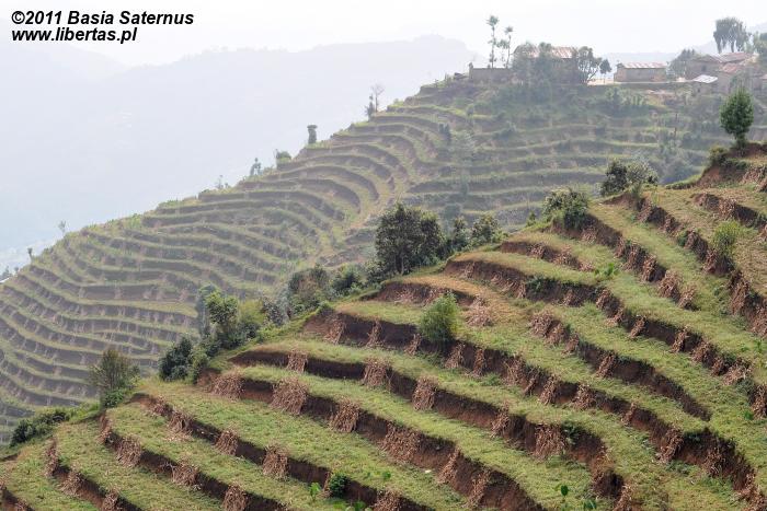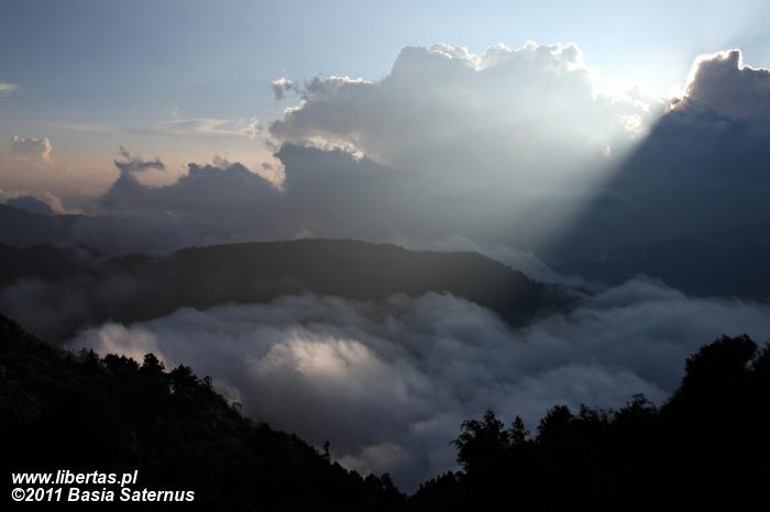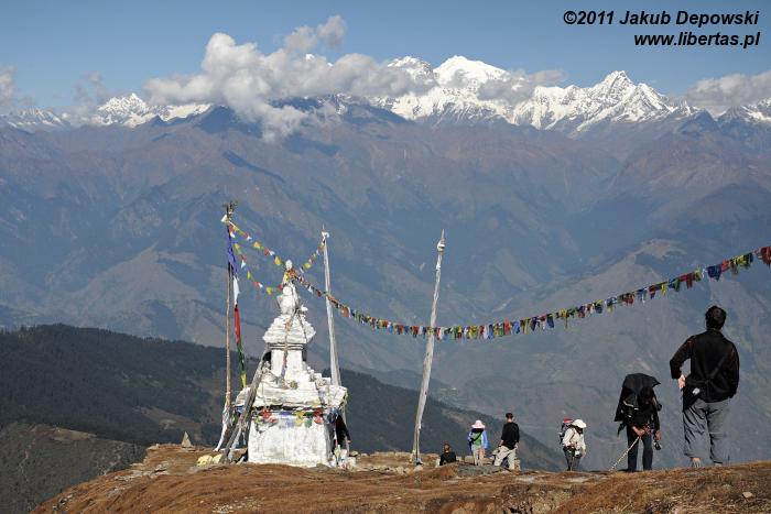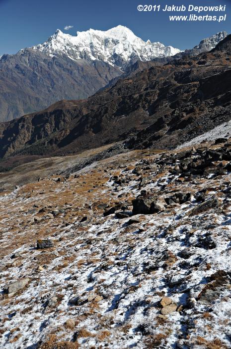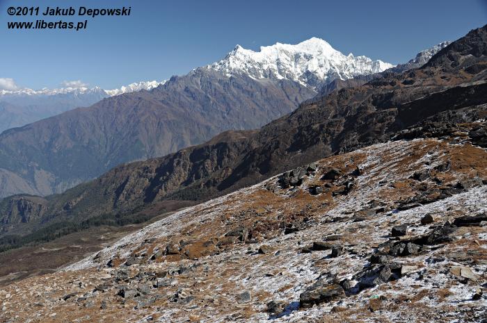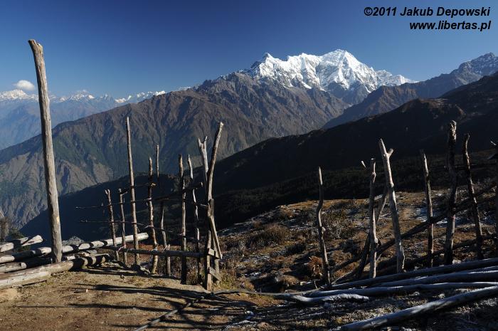 Widok z Laurebiny jest ograniczony, ale i tak robi wrażenie. Chociaż w dwóch kierunkach mocno przesłaniają go masywy Surya Peak (5145 m n.p.m.) i wyrastającego ponad Amakund – kolejnym z tutejszych jeziorek – Chhyarkung Chuli (4830 m n.p.m.), pozostała część horyzontu wynagradza wszystko. Po północno-zachodniej stronie nasze zmysły obficie karmi panorama ośnieżonych Himalajów, po południowo-wschodniej zaś przedstawia się nam Helambu – kraina Szerpów7, a za nią dobrze widoczna już Dolina Kathmandu. W przepalonym porannym słońcem pejzażu przez dłuższy moment próbujemy dojrzeć Thare Pati (Thadepati, 3690 m n.p.m.), Kutumsang (2470 m n.p.m.) czy Chisapani (2165 m n.p.m.) – nasze kolejne noclegowe bazy8. Bezskutecznie. Może są jeszcze za daleko albo ukryły się za jakimś górskim żebrem, a może w splendorze tutejszej przyrody w ogóle nie sposób ich dostrzec.