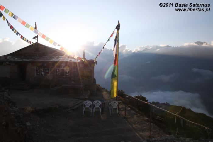 Nie ma jeszcze dziewiętnastej, gdy ciemność otula całą okolicę, a przenikliwy chłód spędza wszystkich turystów oraz ich tragarzy i przewodników do hotelowej świetlicy. Niewielkie, do niedawna niemal zupełnie martwe pomieszczenie szybko zaczyna tętnić życiem. Jest ciepło, ale też bardzo głośno, więc nie do końca przyjemnie. Rozpieszczane ostatnio krystalicznie czystym powietrzem nozdrza z początku mocno drażni ciężka mieszanka, w której da się rozpoznać umykający z prowizorycznego kominka dym oraz lekki swąd przepoconych ciał i nieświeżych ubrań. Na szczęście, gdy tutejszy kucharz śmiało zaczyna wybiegać na przeciw zachciankom targanych niedźwiedzim głodem turystów, a kuchnia rusza pełną parą, na pierwszy plan szybko wysuwają się zapachy dużo przyjemniejsze. Świetlicę szczelnie wypełnia aromat przygotowywanych dań – zapiekanych, mocno pikantnych ziemniaków, ryżu z warzywami, okraszonego jaczym serem makaronu mien i innych tutejszych przysmaków. Na samą myśl o tym, że niebawem nasze podniebienia natrafią na gorącą karmę, a kalorie rozejdą się po łaknącym energii organizmie, robi nam się cieplej, a część zmęczenia od razu ustępuje. Zanim jednak zjemy, przyjdzie nam, jak to w Nepalu, poczekać na posiłek ponad godzinę.