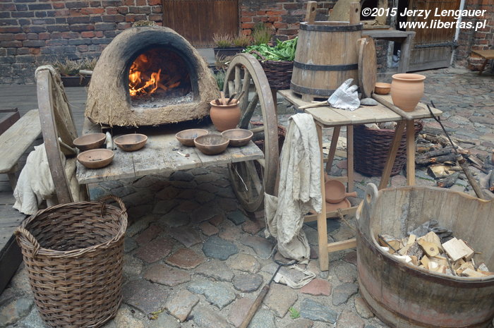 Ach, te dzieci… Jedne nieco przestraszone delikatnym strofowaniem przez wychowawczynie, inne rozbrykane i niezawracające sobie głów poszanowaniem czcigodnych murów zamkowych, bo przecież na to przyjdzie czas dopiero za ileś tam lat… Wszystkie jednak wchodząc przez żelazną bramę, kierowały wzrok ku urządzeniu służącemu ręcznemu mieleniu zboża, czyli żarnom. Jednak to nic, ponieważ parę kroków dalej wydobywa się dym. Pewnie jego zapach uczniowie czuli już na wysokości kościoła św. Jerzego i być może mylili z woniami restauracji. Nie, nie! To coś o wiele przyjemniejszego. Mazurska kuchnia nie tylko była tego dnia do oglądania. W białym (lnianym?) stroju krzątał się przy piecu najprawdziwszy Mazur z podwęgorzewskich lasów i bagien. Krzątał się to mało powiedziane, bo z nieprawdopodobną inwencją, szybkością, pewnością i sprawnością wypiekał chleb.