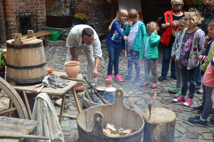 Dzieci mogły obserwować dawny proces powstawania tego najpopularniejszego współczesnego produktu spożywczego od momentu, gdy w zręcznych dłoniach pojawia się garść ziaren zboża, aż do smacznego końca – gotowych gorących kawałków ciemno-brązowo-złocistego, wyjątkowo smacznego, chleba. Do jego degustacji uczniowie ustawiali się w zdyscyplinowanej kolejce. Wszakże ta atrakcja była przygotowana dopiero po dydaktycznej, aczkolwiek, w wesołej formie podanej, opowiastce o średniowiecznej kuchni mazurskiej na najwyższym piętrze muzeum.