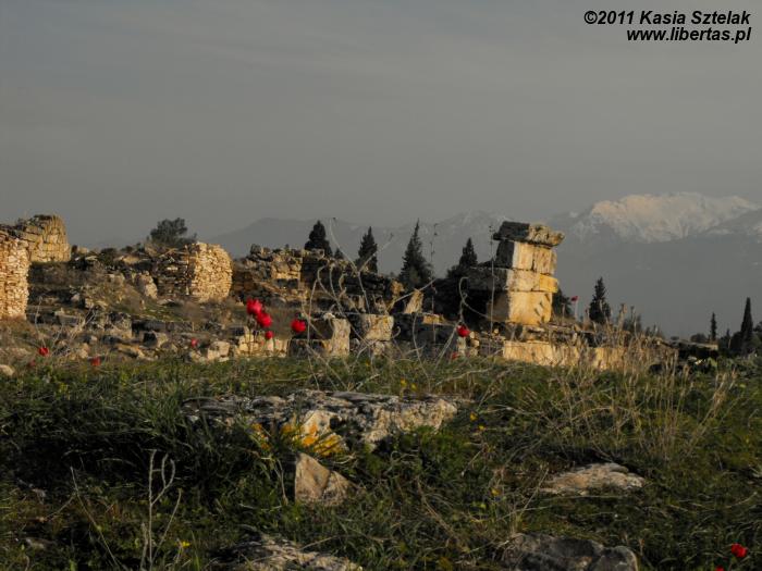 Jednak to, co zrobiło na mnie największe wrażenie, to ogromna Nekropolia, która jest największym cmentarzem w Anatolii. Nie wszystkim udało się powrócić do zdrowia w uzdrowisku, więc ich ciała chowano na miejscowym cmentarzu. Grobowce pochodzą z czasów hellenistycznych, rzymskich czy wczesnochrześcijańskich, kiedy miasto przeżywało swój rozkwit i pełne było życia. Różnorodność grobowców od okrągłych kurhanów, stojących na kamieniach sarkofagów czy prostych rodzinnych grobowców przykrytych płytą porozrzucanych na dużym terenie bez jakiegokolwiek porządku powoduje chwilę zadumy nad miastem, nad tym co pozostało nad upływem czasu. Śpiew cykad towarzyszy nam przez cały spacer po Hierapolis, na całym terenie kwitną czerwone kwiaty, słońce przyjemnie opala twarz, z tyłu zostają piękne zbocza gór. To wszystko powoduje, że wycieczka do Hierapolis zostanie na długo w mojej pamięci.