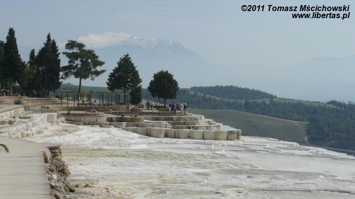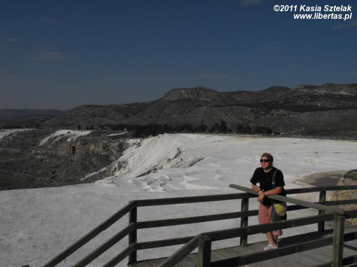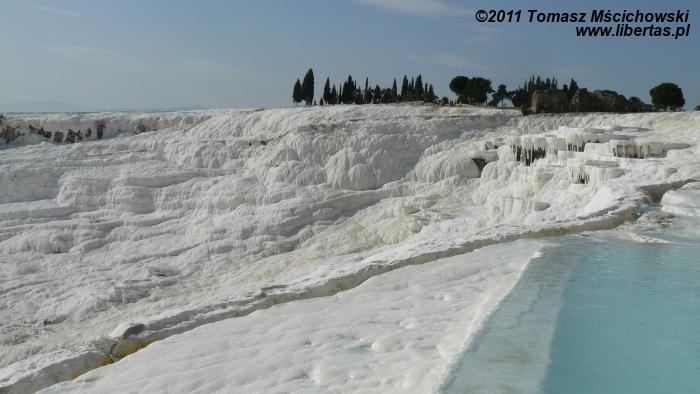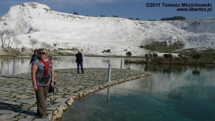 Magiczne Pamukkale (oficjalnie czynne przez całą dobę, wstęp ok. 10 euro) zwane jest też Bawełnianą Twierdzą. Jest to biała kaskada uformowana przez nasyconą wapieniem wodę, która wypływa z gorących źródeł. Obecnie dla turystów otwarta jest do zwiedzania część południowa wzdłuż wybudowanego przez ludzi kanału. Po wapiennych tarasach można chodzić, jednak nie w butach, więc za przykładem całej rzeszy zwiedzających turystów pozostawiamy swoje obuwie przed wejściem i wchodzimy na rozgrzane słońcem wapienie. Słońce chociaż to dopiero marzec przygrzewa bardzo mocno, woda w niektórych miejscach jest dość ciepła, więc przyjemnie jest w niej brodzić. Kąpiele w Pamukkale obecnie są zabronione jednak kilka osób korzysta z tarasów bezkarnie i zanurza się po samą szyję w strojach kąpielowych.