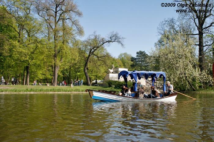 Jeszcze z trawą w butach, przyjeżdżamy do Łazienek. Gdyby Stanisław Poniatowski, pomysłodawca utworzenia zespołu pałacowo-parkowego, nadal żył, zapewne Warszawiacy złożyliby mu specjalne podziękowanie. Chluba stolicy, często odwiedzana przez turystów, ma swój urok i jest świetnym miejscem na odpoczynek. Oczywiście dla ludzi, którym w relaksie nie przeszkadzają tłumy. Pomimo dużej odległości od włoskiej Wenecji, z przyjaciółmi wsiadam do gondoli. Przynajmniej cena rejsu jest dużo tańsza niż jego włoska wersja. Choć podróż jest bardzo krótka, nie żałuję wydanych 7zł. Malutka łódeczka z odświętnie ubranym gondolierem ma duży urok, zwłaszcza, że wokół otaczają nas przyjemne widoki. Początkowo szczególną uwagę przykuwa pałac łazienkowski, lecz chwilę później wszyscy pasażerowie odwracają głowę w odwrotnym kierunku. Na drzewie siedzą dwa wielkie pawie, stojące na przeciwległych gałęziach. Kolorowe ogony malowniczo zwisają z drzewa, ukazując bogatą paletę barw. Ich odgłosy roznoszą się po całym parku. Scena jak z obrazu.