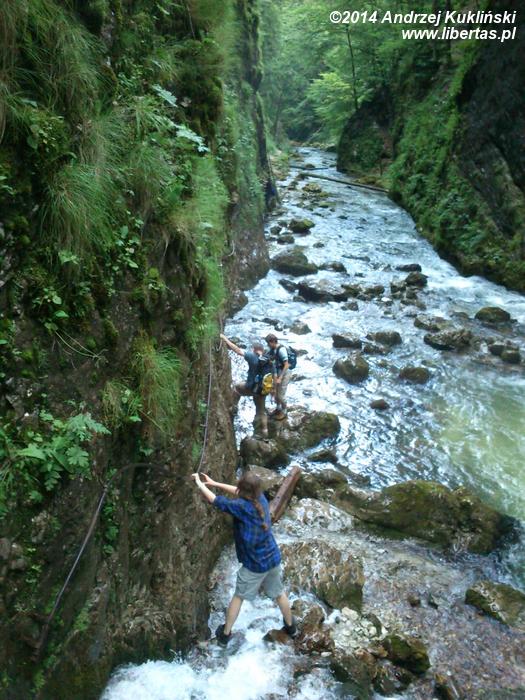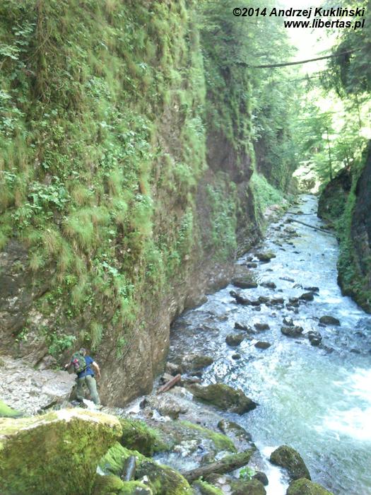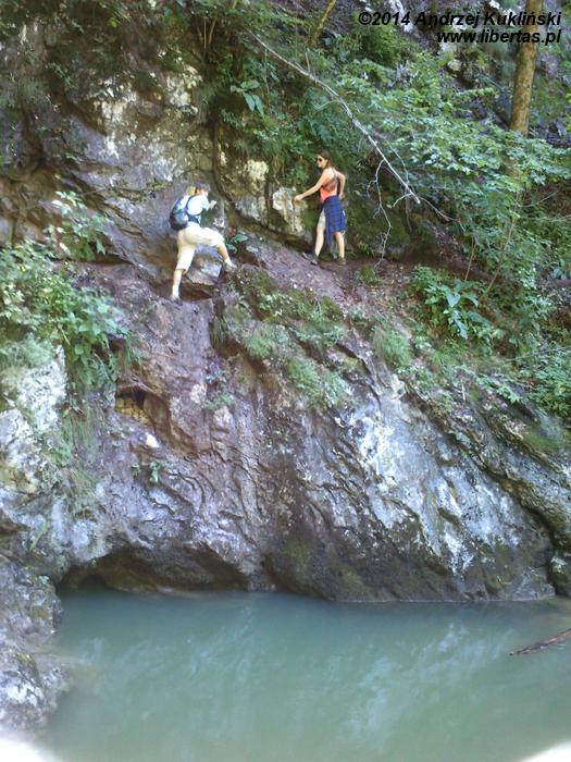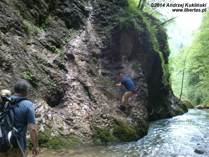 Jasne, że nie wracamy, ale zarówno rzeką, jak i po skale jest tak samo trudno. Do skały po lewej stronie przymocowana jest stalowa lina. Trzeba zejść do koryta rzeki po dość dużych kamieniach, chwycić się poręczy i poszukać miejsca na oparcie nóg na skale. Skała jest oczywiście śliska, przecież spływa po niej woda.