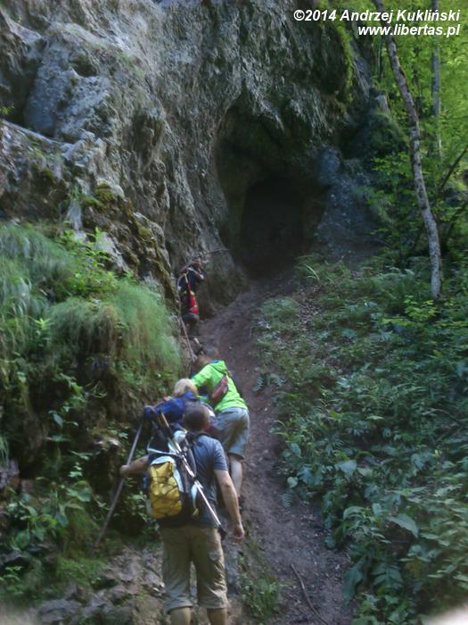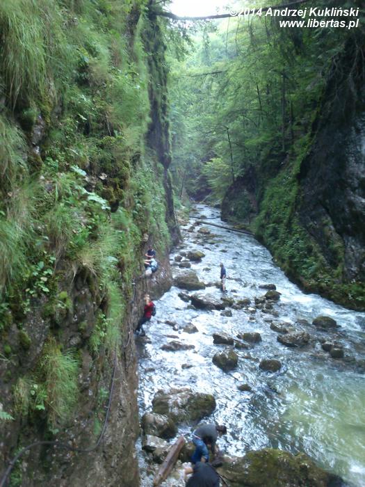 Ścieżką przechodzimy dookoła wywierzyska i przy pomocy łańcuchów wspinamy się na skalną skarpę po lewej stronie rzeki. Szlak biegnie jakiś czas górą, około 30 m nad rzeką. Ścieżka jest dość wąska i raz po raz pojawiają się łańcuchy ułatwiające wędrówkę.