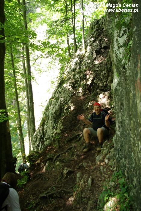To był dopiero początek niespodzianek. Dalej czekał na nas komin skalny, a właściwie błotny – bo po skałach ścieka mokre błoto. Wchodziło się tymi zabłoconym szlakiem około 20–30 m do góry po linie i łańcuchu, by potem, o zgrozo, przez okno skalne na samej górze ujrzeć „zachęcającą” drogę w dół, jeszcze bardziej stromą, ze stalową liną sięgającą tylko do połowy góry, a potem trzeba się uchwycić czego bądź. Ta droga z pionowej przechodzi w poziomą i kończy się tańcem połamańcem na śliskim pniu drzewa. Albo może kończy się normalnie, a ten pień kończy inny, równie ekscytujący odcinek.