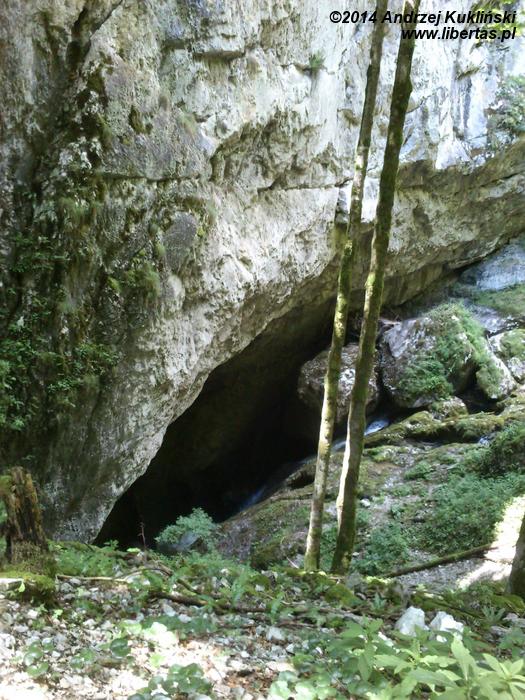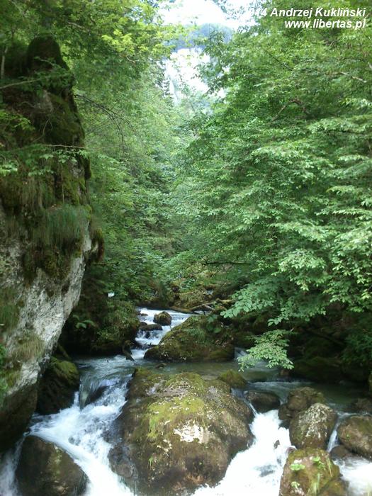 No to idziemy w stylu „na małpę skalno-wodną”. Jak nam się znudzi, możemy wleźć do rzeki. Dno jest oczywiście nierówne, kamieniste (kamienie wielkości ludzkiej głowy, albo półczłowieka, tak że raz woda jest po kostki, a raz za kolana, a i tak chyba co roku inaczej). W ten sposób mamy do pokonania jakieś 250 m.