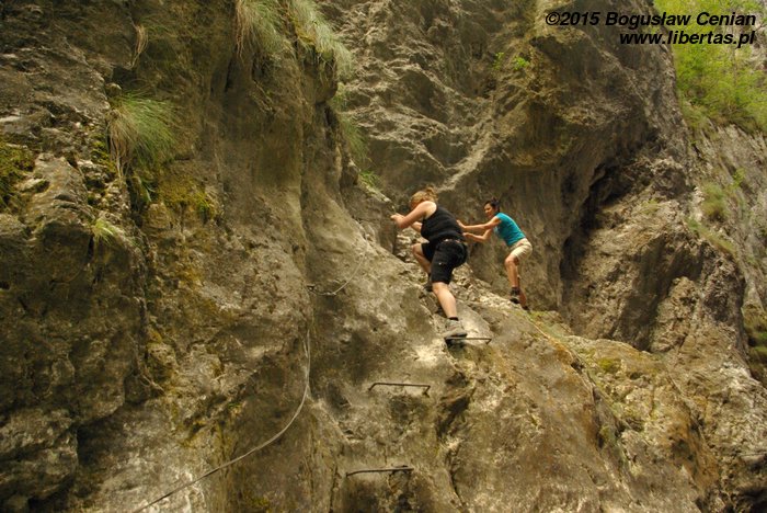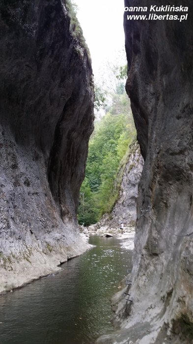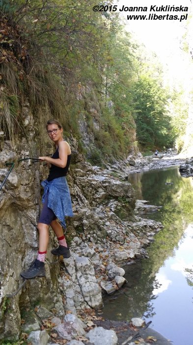 Atmosfera była piknikowa. Weseli i niekoniecznie trzeźwi „turyści miejscowi” nie byli odziani turystycznie, tylko „niedzielnie”. Trasa z początku wydawała się bardzo łatwa. Ale im dalej tym było trudniej. Skały robiły się śliskie, a zabezpieczenia nie wystarczały, jeśli ktoś miał krótsze nogi niż wysoki turysta rodzaju męskiego. Dlatego nie wszyscy przeszli szlak do końca, trzeba było poczekać z naszym dzielnym małoletnim, któremu jeszcze nogi nie urosły dostatecznie. Woda była płytka w większości miejsc, ale bywało i tak, że dorosłej osobie sięgała do pasa.