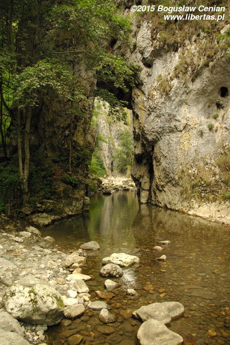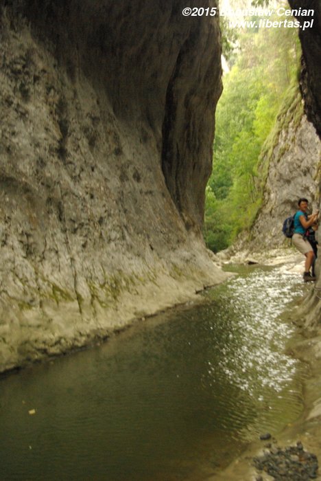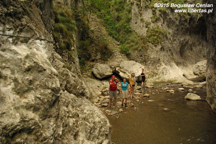 Pierwszym z nich, i pewnie decydującym, była pora wycieczki – połowa sierpnia i wyjątkowa susza tego lata – stąd niski poziom wody. Drugim – nasze zmęczenie poprzednimi wyprawami. Dzień wcześniej wspinaliśmy się w upale na Szeklerską Skałę i większość ekipy marzyła o kąpieli w strumieniu oraz pikniku, a nie o pokonywaniu łańcuchów i klamer po śliskich ścianach wąwozu.
