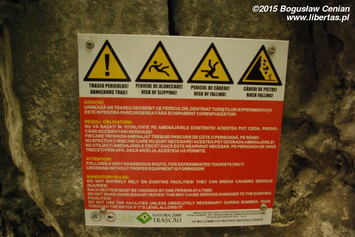 Dopiero teraz, przeglądając zdjęcia, wczytałam się dokładnie w treść ostrzeżenia. Jest tam wyraźnie napisane, żeby nie polegać całkowicie na zainstalowanych urządzeniach pomocniczych, bo mogą się zerwać. Proszę z nich korzystać w przypadku absolutnej konieczności. Latem proszę iść rzeką!