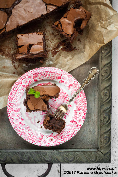Upieczone brownie ma wierzch błyszczący, wyglądem przypominający papier i może popękać. Środek wygląda jak niedopieczony, ale ma absolutnie genialny w smak i fantastyczną konsystencję. Takie jest właśnie brownie, może nie najpiękniejsze, ale za to jak smakuje!