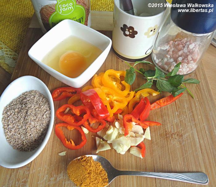 Pokrój warzywa i zioła, zeszklij je na patelni razem z olejem kokosowym (1–2 minuty). Jajko wymieszaj z jogurtem oraz otrębami, dodaj na patelnię i smaż, aż się zetnie.