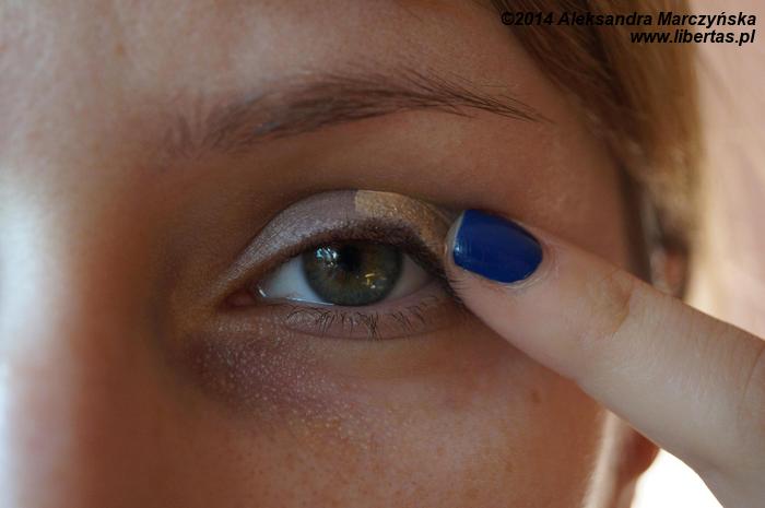 Całą powiekę pokrywamy podkładem (jeżeli mamy tłuste powieki, do ich zmatowienia możemy położyć dodatkowo korektor).