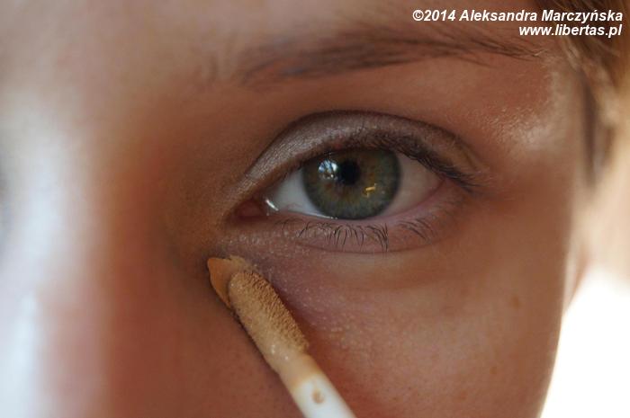 Korektor nakładamy w kącikach oczu i przykrywamy ewentualne cienie pod oczami. Dzięki temu nasze spojrzenie będzie się wydawać bardziej wypoczęte.