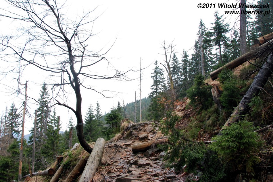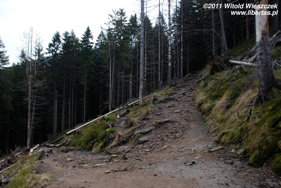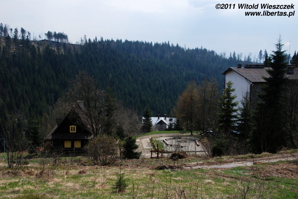 Z Baraniej Góry idziemy dalej niebieskim szlakiem w kierunku Polany Przysłop. W pobliżu znajdują się źródła Czarnej Wisełki i teren jest podmokły, w związku z czym ścieżkę wyłożono drewnianymi balami. Niestety po obfitym deszczu część bali unosiła się na wodzie i trzeba było wykazać się odrobiną ostrożności, żeby nie zaliczyć nieplanowanej kąpieli. Poza tym zejście jest bardzo przyjemne i dopiero przed Polaną Przysłop robi się trochę bardziej stromo. Tutaj znajduje się niezbyt pasujący do górskiego krajobrazu, a postawiony w latach 1973-1979, trzypiętrowy budynek schroniska PTTK i Muzeum Turystyki. Niestety do środka nie weszliśmy, bo muzeum jest otwarte tylko w soboty i niedziele od 1 maja do 12 października.