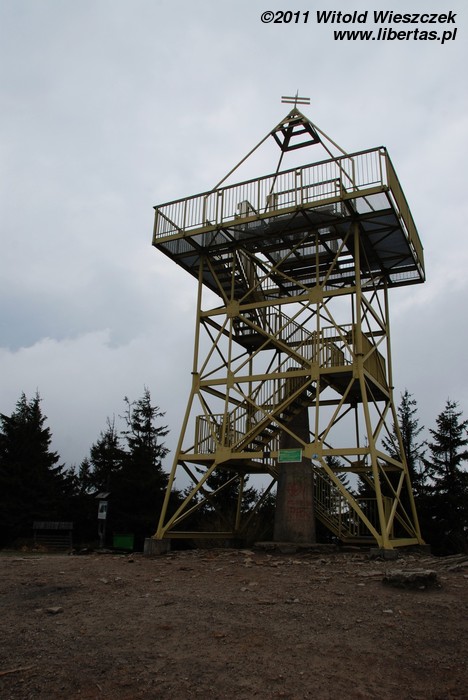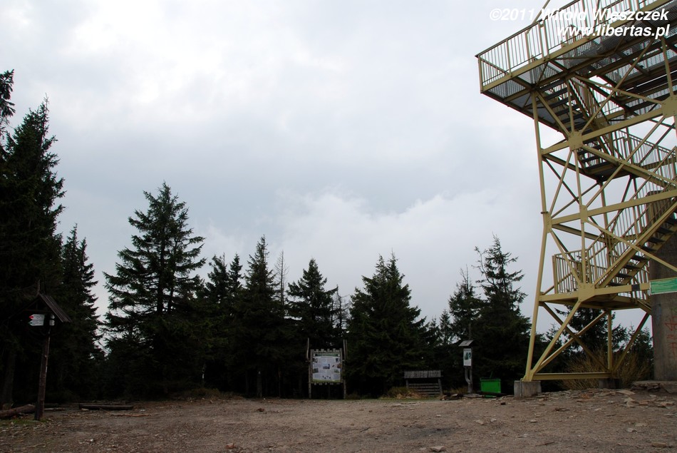 Na górze znajduje się stalowa wieża widokowa o wysokości 15 metrów (wstęp bezpłatny). Z podestu znajdującego się na wysokości dziewięciu metrów roztacza się piękny widok na okoliczne szczyty, między innymi na: Skrzyczne – najwyższy szczyt Beskidu Śląskiego, który łatwo rozpoznać po charakterystycznej wieży radiowo-telewizyjnej, Babią Górę, Pilsko, Stożek Wielki, Cieślar, Wielką Czantorię i Równicę. Przy odrobinie szczęścia, jeśli pogoda sprzyja, widać nawet Tatry. Niestety aura nie była dla nas łaskawa i nawet kontur wieży na Skrzycznem ledwie majaczył w chmurach.