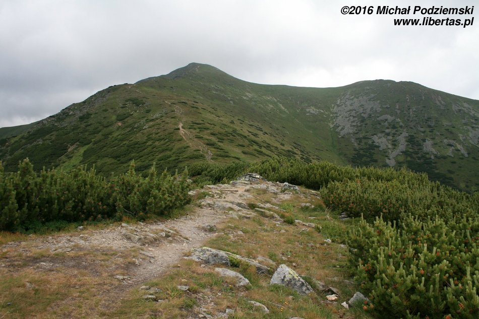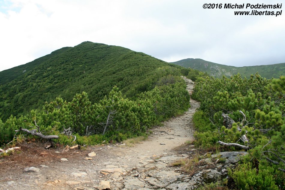 Trzymamy się żółtego szlaku i kontynuujemy wędrówkę, teraz już bezpośrednio na zaplanowany na dzisiaj dwutysięcznik. Dojście tam powinno zająć nam jakieś dwie godziny. Pierwsza część tego odcinka prowadzi jeszcze wśród kosodrzewiny, gdzie czekają nas łagodne wzniesienia i coraz rozleglejsze widoki – niedługo na wprost przed nami ukaże się nam masyw Barańca.
