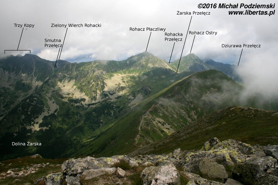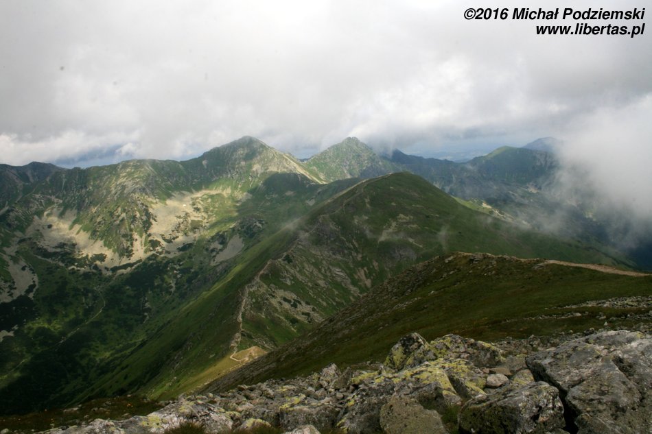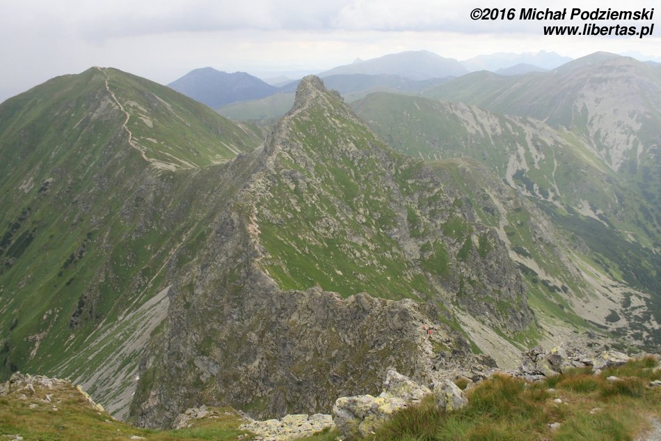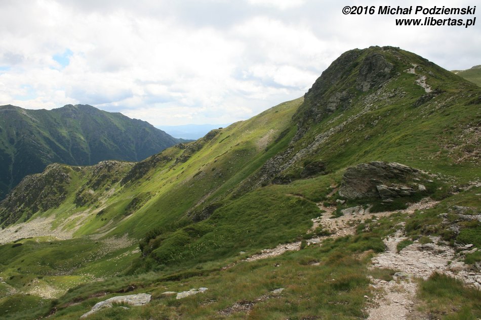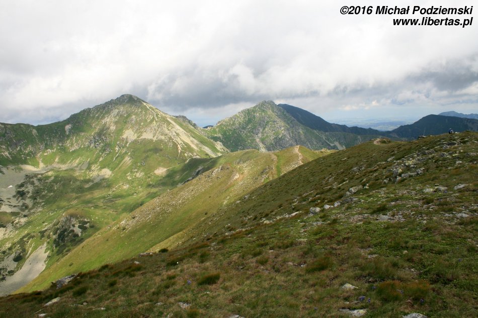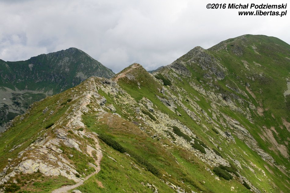 Pozostając przy żółtych oznaczeniach, rozpoczynamy zdecydowanie najprzyjemniejszy i najbardziej uroczy fragment dzisiejszej wycieczki. Jest to półtoragodzinny spacer granią, podczas którego w pełnej okazałości objawiają się nam doliny Żarska (po lewej) i Jamnicka (po prawej stronie). Ponadto z każdym krokiem zbliżamy się do Rohaczy, a więc łagodny krajobraz dolin coraz intensywniej kontrastuje z surowymi i ostrymi grzbietami.