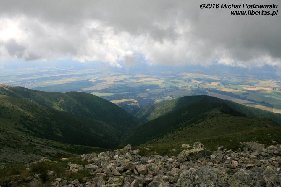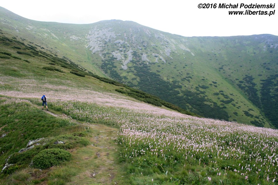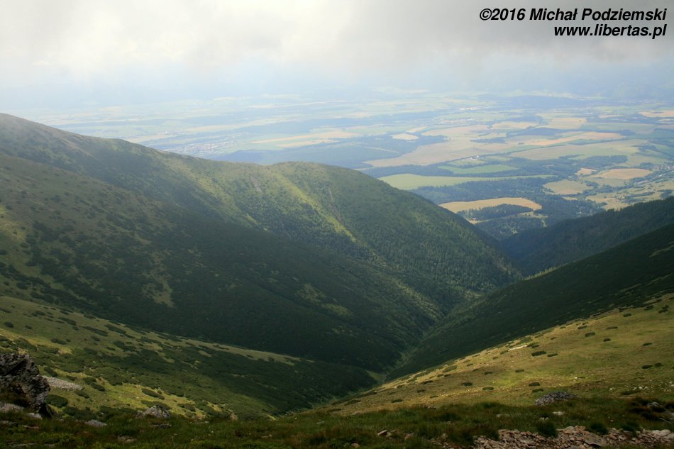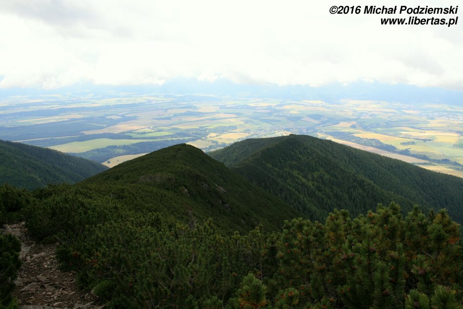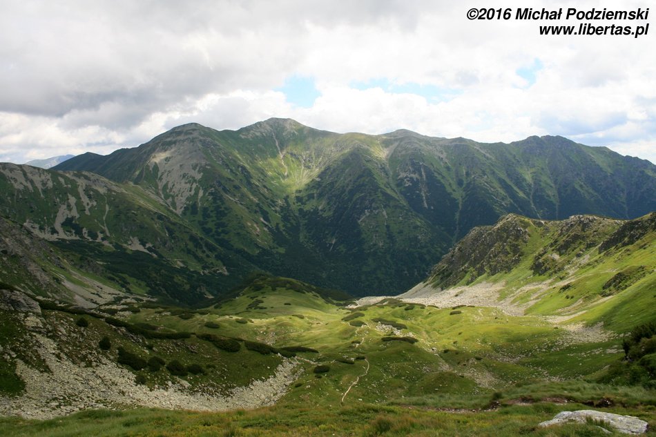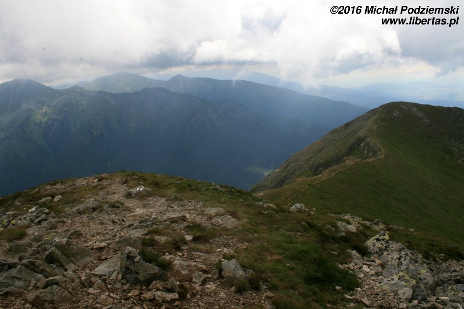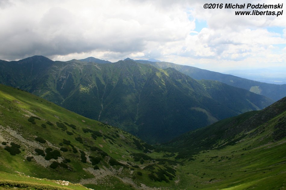 Pozostając przy żółtych oznaczeniach, rozpoczynamy zdecydowanie najprzyjemniejszy i najbardziej uroczy fragment dzisiejszej wycieczki. Jest to półtoragodzinny spacer granią, podczas którego w pełnej okazałości objawiają się nam doliny Żarska (po lewej) i Jamnicka (po prawej stronie). Ponadto z każdym krokiem zbliżamy się do Rohaczy, a więc łagodny krajobraz dolin coraz intensywniej kontrastuje z surowymi i ostrymi grzbietami.