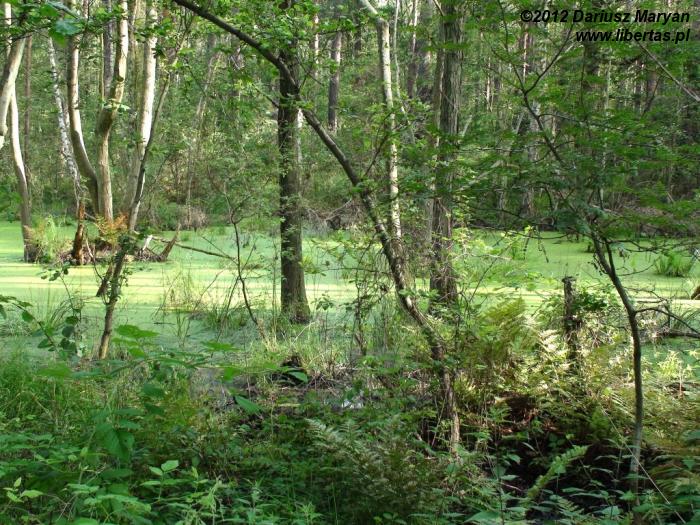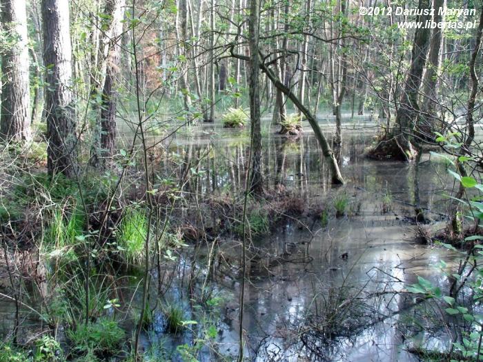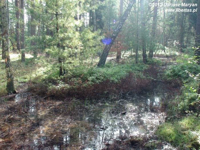 Tuż za wielkimi zbiornikami na gaz w budowanym właśnie gazoporcie skręciliśmy w las, którym chcieliśmy dojść do punktu widokowego Goben. Dystans – niecałe dwa kilometry. Po drodze mijaliśmy bardzo malownicze bagienka, które w porannym słonku mieniły się wieloma barwami. Niestety, jak każde bagienko i to było wylęgarnią komarów, które zmuszały nas do szybszego marszu.