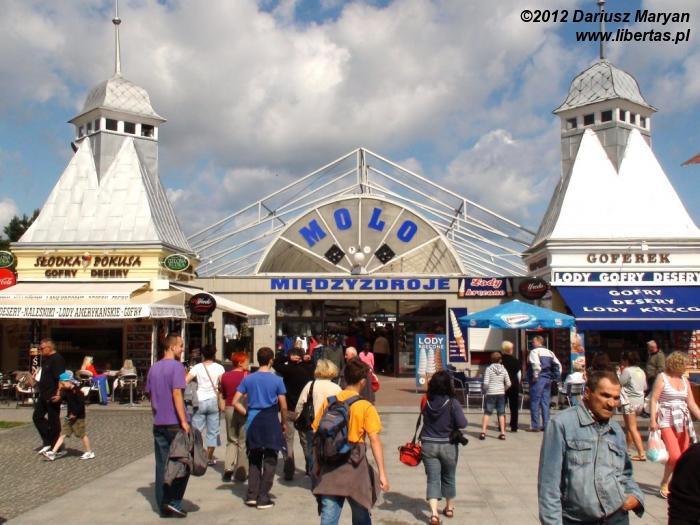 W Międzyzdrojach wysiedliśmy tuż obok Muzeum WPN, które akurat tego dnia było zamknięte. Ruszyliśmy więc pod pomnik upamiętniający żołnierzy poległych podczas wojny, w pobliżu którego znajduje się mały kuter z napisem Międzyzdroje. Jest to idealne miejsce, aby zrobić sobie pamiątkowe zdjęcie. Z centrum miasta ruszyliśmy w kierunku molo i Promenady Gwiazd. Tak jak się spodziewałem, cały ten teren był rozdeptywany przez setki urlopowiczów. Cóż, będąc w tym mieście, choć przez chwilę trzeba przespacerować się po długim na prawie 400 metrów betonowym molo. Tego dnia jednak wiatr był dość paskudny (nadchodziło pierwsze załamanie pogody) i zbyt długo nie zabawiliśmy w tym miejscu.