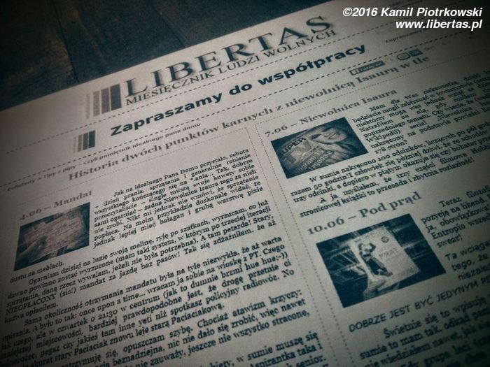 Ha! Stało się! Jakiś czas temu dostałem propozycję współpracy z poczytnym miesięcznikiem. Takim prawdziwym, mającym nawet numer ISSN! Miesięcznik jest online i – tu Was zaskoczę – wydawany jest co miesiąc. Od lipca najlepsze z moich wypocin są publikowane na łamach Miesięcznika Ludzi Wolnych „Libertas”. Bierzcie i czytajcie z niego wszyscy (mam nadzieję, że nie grozi mi ekskomunika). Może jeszcze wyjdzie z tego coś fajnego, kto wie? Aż sobie musiałem wydrukować. Teraz będę żyć z tantiem (tych urojonych) z LIBERTAS.PL.