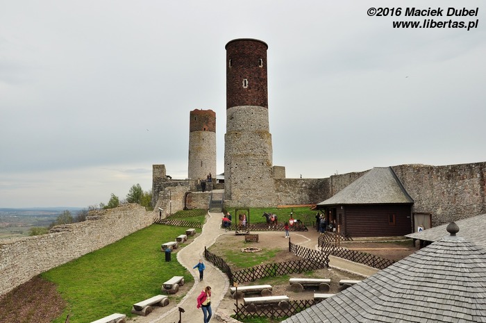 W sąsiedztwie drewnianych postaci królów i innych osób, zasłużonych dla Chęcin, wkraczamy na zamek wschodnią bramą. Zamek Górny to starsza część warowni. Pierwotnie istniał jako pojedyncza wieża o średnicy 8 metrów. W XIV wieku zyskał kształt prostokąta. Po wschodniej i zachodniej stronie zamku zostały wybudowane wieże. Do zamku można było dostać się jedynie po moście przytwierdzonym do bramy. Do naszych czasów przetrwała kaplica, a nad nią przechowywano skarbiec. Dziś można wejść do skarbca, a nawet „dorzucić” do niego parę gorszy. Najbardziej emocjonującym miejscem na zamku jest wieża, którą należy zdobyć o własnych siłach. Gdy już wyjdziemy na jej szczyt, szybko zapomnimy o pokonanych stu dziewięciu krętych schodach. Widok, który rozpościera się na okolicę, rekompensuje wszelkie trudy. Wprawne oko zobaczy w oddali Łysą Górę ze Świętym Krzyżem, a czasami, przy dobrej widoczności, z wieży można zobaczyć Tatry. Niektórzy zwracają uwagę na ukształtowanie terenu: na północ od zamku, w kierunku Kielc, obszar jest górzysty i zalesiony, natomiast od południa dominuje teren niezalesiony i równinny. To granica między Górami Świętokrzyskimi a Niecką Nidziańską.