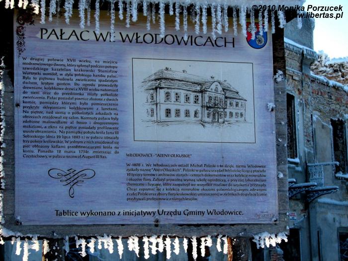 Pałac we Włodowicach zbudowany został z kamienia i cegły, jako piętrowa budowla zwieńczona spadzistym dachem. Komnaty zdobiły cenne makaty a na sufitach podziwiano malowane freski, (zachowały się podobno fotografie jego wspaniałych wnętrz). Istniały trzy specjalne pokoje zwane królewskimi urządzone na cześć Jana II Sobieskiego, który 26 lipca 1683 roku jadąc z odsieczą wiedeńską odpoczywał w pałacu. Na pamiątkę tego wydarzenia postawiono piece zdobione kaflami z wizerunkiem króla na koniu. Wiosną 1734 roku zdążając do Częstochowy we dworze zatrzymał się wraz ze swoim orszakiem August III Sas.