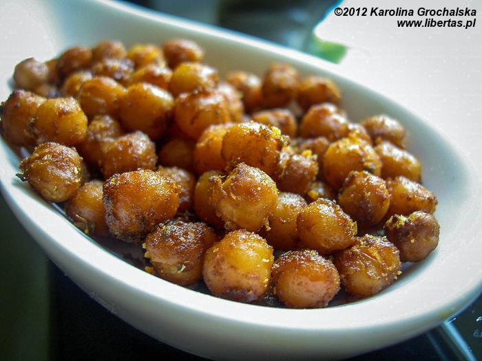 Ugotowaną lub odsączoną i osuszoną ciecierzycę przełożyć do miski. Dodać olej i dokładnie wymieszać, aby ziarenka się nim pokryły. W osobnej miseczce wymieszać wszystkie przyprawy i cukier, a następnie dosypać do miski z ciecierzycą. Dokładnie wymieszać i przełożyć na blaszkę wyłożoną papierem do pieczenia. Ciecierzyca ma być dość luźno rozłożona, aby równomiernie się prażyła, nie może nachodzić na siebie.