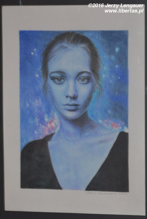 Lecz to nie wszystko, bo ciekawość oglądających prace artystki może nigdy nie zostać zaspokojona. Czy to wybryk, czy świadomy wybór, żeby nieco gości zaintrygować? Skąd ów niebieski kolor dostał się do dwóch szkiców? Wymknął się spoza drapaczy chmur Manhattanu, czy odsłoniły go kwitnące wiśnie, na którejś z japońskich wysp? Skrawek nieba spadł na chwilkę i rozpostarł się pod śpiącymi, czy też czuwającymi psami? Jeśli artystka tak przyjemnie, tak kołysząco i uspokajająco, tak symbolicznie bezpiecznie kojarzy odcienie niebieskiego i plamki zieleni, to pewnie kiedyś i gdzieś wpatrywała się w lekko kołyszące się morze, jezioro z unoszącym się na nim wiosennym liściem, może przez nią samą zerwanym? Może to i ona na jedynym bardzo barwnym (w porównaniu do pozostałych) portrecie? Mglista, niebieska, eteryczna i gwiaździsta… Przemykająca ze swoją sztuką między niebem a Ziemią, tą niebieską i zieloną, tak widzianą z Kosmosu…